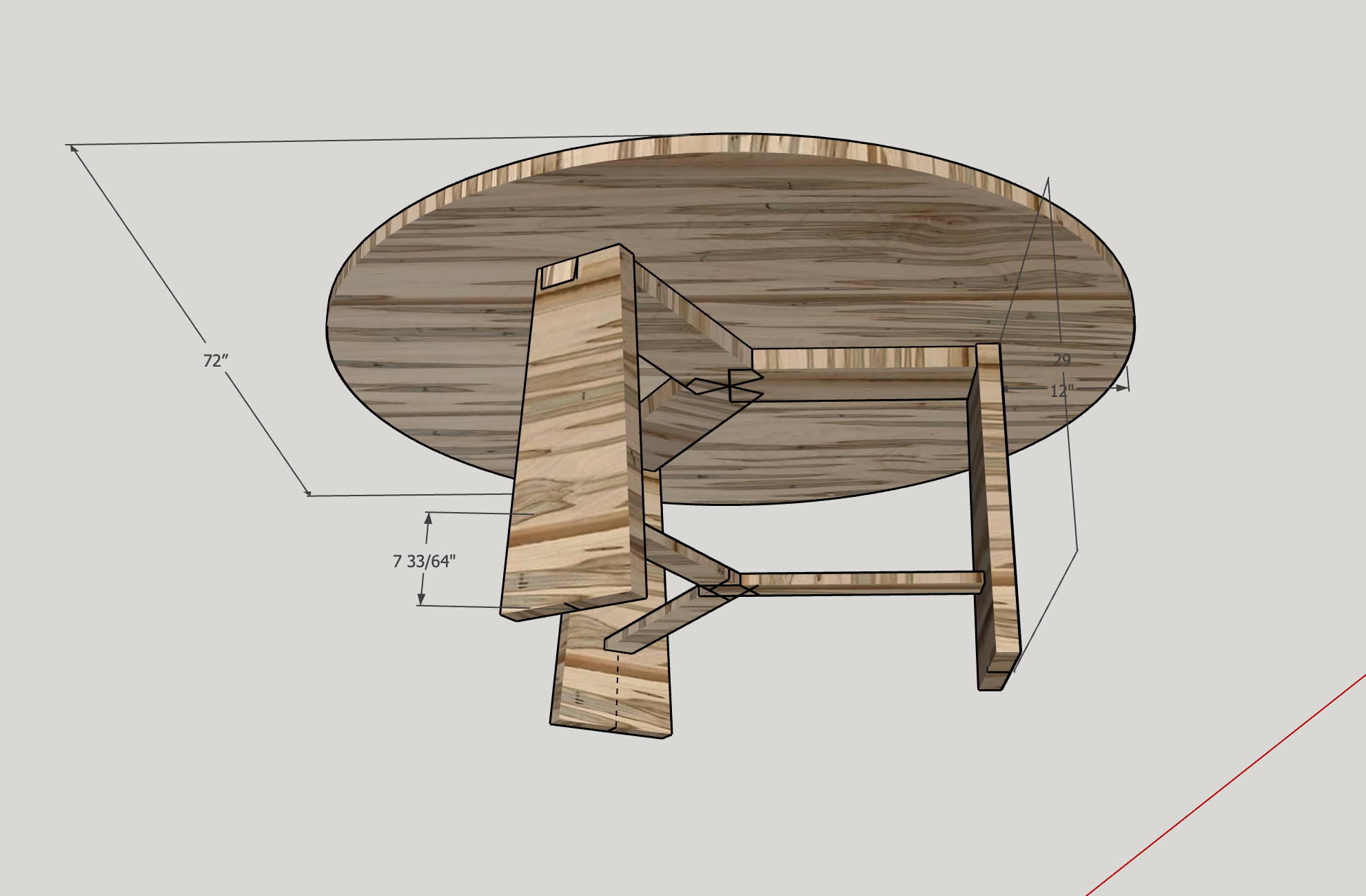 A 72” ( 6 Foot ) circular dining table designed to seat 8. The base is a three legged design featuring traditional hand cut joinery. the table comes in two pieces - the top and the base for ease of movement and shipping.